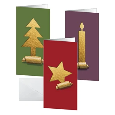 For a special Christmas message that you can customise and print yourself. With an exclusive motif and printed in a matter of seconds: Set of Christmas Cards "Cut-out style" (Motif: 4x star, 3x tree, 3x candle in gold, Red, Green) in the DL format (White cardBoard, 250 gsm, 10 cards) | Incl | 10 matching gummed envelopes. Made in Germany | Contemporary, minimalist design FSC-certified: high-quality, environmentally friendly paper from responsible sources | Suitable for all inkjet and laser printers and copiers, or to write on by hand Folding cards for your Christmas post, invitations or Christmas menus | Discover all the other designer products in the Cut-Out-Style (Collection comprises writing paper, envelopes, cards, gift bags and gift wrap.) collection.