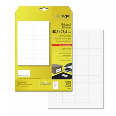 1000 White labels on 25 A4 sheets for professional, efficient and permanent labelling Label size: 4,85 x 2,54 cm | 40 labels per A4 (21 x 29,7 cm) sheet Adheres permanently and securely to all surfaces - ideal for labelling and marking a wide variety of objects Clear print image and perfect protection for the machine thanks to the safety margin on all 4 sides Suitable for all inkjet and laser printers and copiers