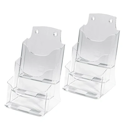 2 three tier brochure stands for A5 (14,8 x 21 cm) leaflets, brochures, magazines, pamphlets, etc | Product dimensions: 17,5 x 29 x 15 cm High-quality transparent, acrylic table-top displays (thickness 2 mm) with a racking depth of 30 mm (each compartment) With ribbing inside the base so that brochures do not slip down or crease and the curved back keeps the printed material perfectly upright - Furthermore, all holders can be combined by means of the linking mechanism at the side 25-year guarantee on the UV-resistance of the acrylic (the material will not Yellow) - Further information can be found below "Technical Specification"
