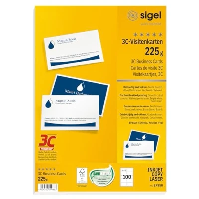 SIGEL LP850, 85x55 mm (A4), Business Cards, 3C, smooth cut all around, 225 gsm, printable, bright White, 100 Piecesequal to10 sheets