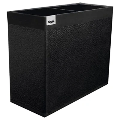 This elegant and tasteful "cintano S" Black pen holder adds elegance to your workspace - SIGEL gives a 2-year guarantee on when the enclosed instructions for care and use are followed; further information can be found below "Technical Specification" Classy pencil cup made of matt, high-quality imitation leather with a fine grained structure in Black with 2 separate compartments offer space for writing utensils and other office implements Product dimensions: 13 x 10.7 x 6 cm; inner dimensions of each compartment are 5.9 x 9.8 x 5 cm Slip-proof underside due to the fine microfibre material which will not leave scratches on your furniture Can be combined with all "cintano S" products: desk pad (SA531), mouse pad (SA532), memocenter (SA533), pen pad (SA534), paper clip holder (SA536)