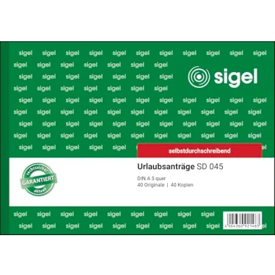 Self-copying practice-proven form for applying and approving leave on one sheet With coloured copy | Each sheet has ultra-fine micro-perforation for quick and clean separation Form book with particularly durable special backrest and integrated desk pad for folding FSC certified: high-quality, environmentally friendly paper from responsible sources. Made in Germany