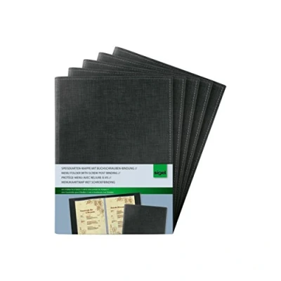 5 classy imitation leather menu folders with linen structure and contrasting stitching Exchange or add more pages in a matter of seconds due to the scrw post binding Product dimenstions: 18 x 24,5 x 1,5 cm Each menu cover has 4 transparent pockets with 4-hole punching for 8 A5 (14,8 x 21 cm) pages Additional pockets are also available (product no | SM191 - 10 Pieces.)