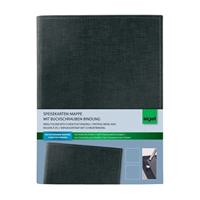 One classy imitation leather menu folder with linen structure and contrasting stitching Exchange or add more pages in a matter of seconds due to the scrw post binding Product dimenstions: 18 x 24,5 x 1,5 cm Each menu cover has 4 transparent pockets with 4-hole punching for 8 A5 (14,8 x 21 cm) pages Additional pockets are also available (product no | SM191 - 10 Pieces)