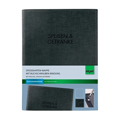 This stylish menus folder meets special quality requirements: Made of durable and textured faux leather finished with high quality embossing and elegant contrast stitching they stylishly present meals and drinks. With blind embossing: Food and drinks Due to the flexible, concealed bolts book-binding, the handling is straightforward and offers in DIN A5 can be replaced quickly and easily. Includes 4 transparent covers for 8 pages.