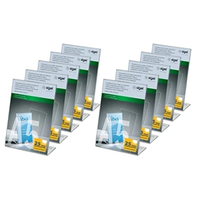10 sign holders for A5 (14,8 x 21 cm) inserts - easy to use: simply slide the paper into the display Product dimensions: 15 x 21,5 x 6,5 cm High-quality clear, acrylic table-top displays (thickness 1,8 mm) for single-sided presentation 25-year guarantee on the UV-resistance of the acrylic (the material will not yellow) - Further information can be found below "Technical Specification"