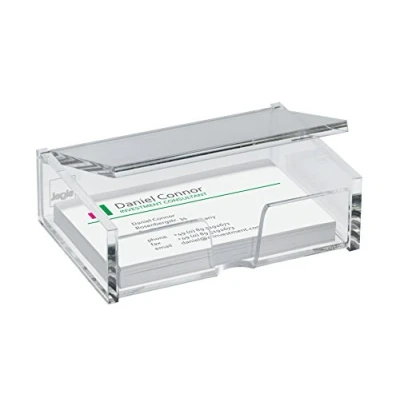 Practical desktop business card holder made of high-quality, clear acrylic Easy removal down to the last card due to the practical cut-away front With flip-top lid to protect your cards For up to 80 business cards (max | 9 x 5,8 cm) The product dimensions are 10 x 6,5 x 3 cm