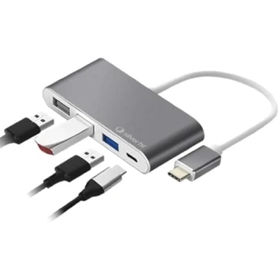 Logan USB-C 4-in-1 Hub. Compatible with iPhone 15 4 output connections 1 x USB Type-C 3.1 output with PD technology for ultra-fast charging 100W (20V/5A) of computers, tablets and smartphones and data transfer. 1 x USB 3.0 output (5V/900mA) with data transfer 2 x USB 2.0 outputs (5V/500mA) with data transfer Plug & Play, no installation or drivers required Outer material in aluminium and ABS Compatible with Windows, Apple and Android computers, tablets and smartphones Dimensions 78 x 36 x 12 mm // Cable length 95 mm