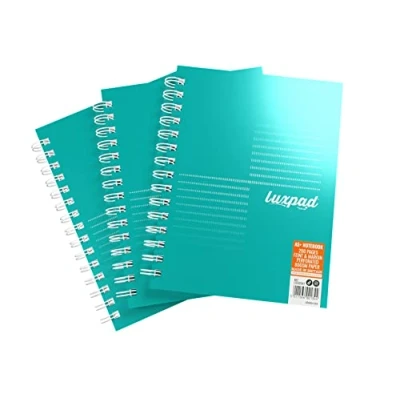 Triple pack of A5 notebooks, each with 200 pages of high quality 80gsm paper enabling you to write on both sides of every sheet without ever having to worry about showthrough. The 8mm feint ruled lines and margin fade subtly into the background as you write making your notes appear more prominent on the page. The wire binding allows the pad to lay flat on any page while punch holes and micro-perforations make page filing a breeze. The paper is sourced from sustainable forests only, so you can scribble away safe in the knowledge that every last page is FSC certified and climate friendly. A gloss coating on the metallic turquoise covers provides an extra layer of protection - making them both durable and wipeable.