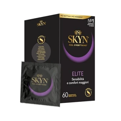 LATEX FREE: made from a technologically advanced polyisoprene material that is completely latex free; lubricated with non-icidal silicone lubricant SK-70 (dimethicone) Even thinner and softer: Skyn Elite condoms are 20% thinner than the original Skyn, now available in 60 stock format! Odourless: SKYN condoms are latex-free, so they are naturally free from the smell characteristic of natural rubber latex Nominal width 53 mm, length 180 mm, thickness 0.05 mm; condoms with reservoir, smooth and transparent ELECTRONICALLY TESTED SKYN condoms undergo electronic testing to ensure that each individual condom meets the highest quality standards; ISO23409 certification