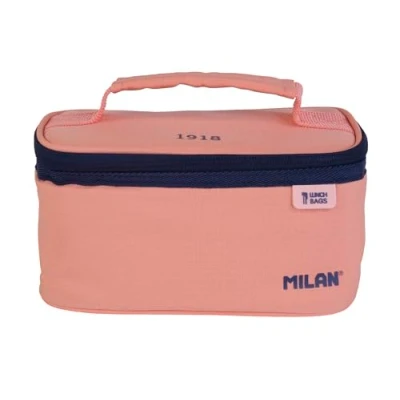 Small cooler bag, convenient and handy. Series 1918 pink with navy blue details. Inspired by the original colours and design of the Milan erasers. Includes a rectangular container with pink lid. Heat-insulating inside (cold/warm) for better storage of food Full opening for better accessibility and cleaning. Handy interior zip pocket with top handle Outer fabric 'ripstop': lightweight and tear-resistant. Use a special technique that knits thick reinforcement threads at regular intervals in a crossed pattern. Fabric composition: outer polyester and insulating inner lining (P.E.V.A.). Dimensions: 22 x 12.5 x 12 cm. Capacity: 1.5 litres