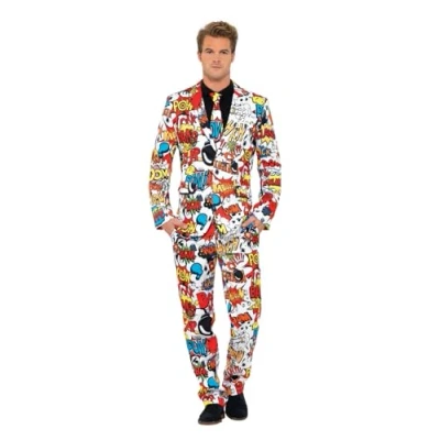 AmazonIncludes Comic Strip Suit, Red & White with Jacket, Trousers and Tie Chest 42"-44" / Waist 36"-38" / Leg Inseam 33" Our dedicated in-house Safety team ensure that all of our products are manufactured and rigorously tested to comply with the latest EU and American Safety standards and regulations. Smiffys is a leading fancy dress supplier and family business with a 125 year heritage in costumes, wigs, make up and accessories. Please note that all our Smiffys products will always come in full Smiffys branded packaging., Manufacturer: Smiffy's