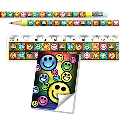 108 pieces of smiley face-themed stationery 36 notepads, 36 pencils and 36 erasers Each features a matching smiley face design Ready to divide up and distribute as end of term or party bag gifts Ideal for use in schools and clubs
