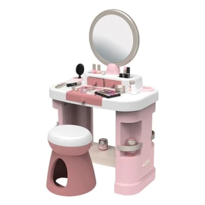 The My Beauty Dressing Table is a must-have in the world of beauty. The product takes up the 3 favorite themes of beauty through its accessories: hairstyle, nail art and makeup. Its sleek design and soft colours will blend perfectly in your child's room. The product features a large tilting mirror, drawers, pots and storage hatch for storing accessories. 15 dummy accessories included: 2 lipsticks with mechanical functions, 2 varnish, 1 mascara, 1 eyeshadow palette, 3 jars, 2 bottles, 1 comb, 1 brush, 1 ring and 1 headband. Structure of the dressing table in blown plastic ensuring perfect rigidity and robustness over time. This toy contains at least 60% recycled material. Suitable for ages 3 years and over. Made in France. Makeup is fake., Manufacturer: Smoby Toys