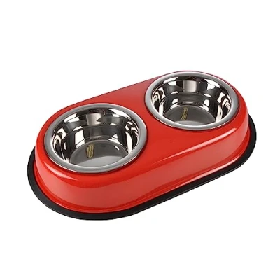 ️ INCLUDED – Stainless Steel Double Bowl with Non-Slip Metal Stand 2 x 350 ml 2 x D13.5/9 cm Glossy Red 🛡️ STRONG AND DURABLE - Metal bowls are ideal for withstanding the bumps and rigors of everyday use ANTI SLIP - With a specific base, this bowl stays in place, preventing unwanted slipping while your pet is feeding or drinking. Simplified maintenance: This bowl can be easily cleaned in the dishwasher. Generous capacity: with these two 350ml bowls for food and water.