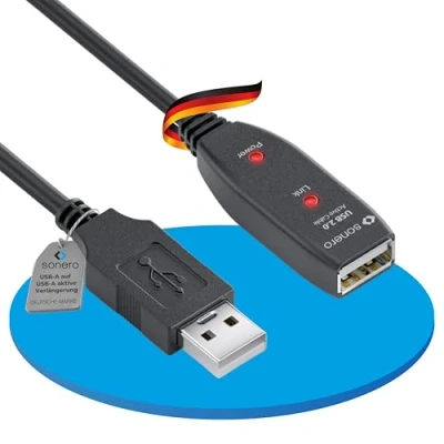 The Sonero Active USB 2.0 Extension Cable has a USB-A plug and USB-A plug. This means that an existing USB cable can be extended over longer distances without any problems. With a throughput of up to 480 Mbps, this cable is USB 2.0 compliant. The active signal amplifier allows data transmission up to 20 m. No drivers or other are required to operate this cable, it can simply be connected and used. Sonero signal booster cable can allow long distance USB connection without separate power supply. When using devices with higher supply voltage, the separate DC power connection can be used (power supply not included) Box contents: 1x Sonero Active USB 2.0 extension cable