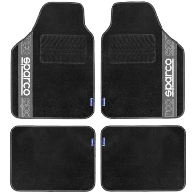 Complete set of 4 Sparco model 510 carpet mats. Made from polyester to the highest quality standards. With embossed tyre pressure on the side skirts. Sporty design with Sparco logo on the sides. Universal, suitable for all cars with or without standing gas. With built-in anti-slip technology. Front dimensions 66 x 47 cm, rear dimensions 37 x 47 cm.