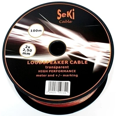 SeKi transparent speaker cable 100 m, the cable section is 2 x 2.50 mm², easy polarity identification thanks to colour marking or repeated lettering on conductor. The speaker cable has high flexibility and breakage resistance and is therefore ideal for wiring your stereo system, audio system, Hi-Fi, speakers or music system. SeKi speaker cables have a CE mark and performance declaration in accordance with the European BauPVO standard no. 305/2011 and are therefore suitable and approved for permanent installation (also built-in) in buildings. In order to create the best sound possible for a fair price in your HiFi environment, we rely on a CCCA internal conductor. Our 100 m 2.50 mm² clear speaker cable comes on a reel. The cable is marked by the metre, so nothing stands in the way of individual assembling.