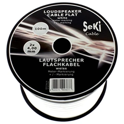 100 metres of extremely flat (3.0 x 17.5 mm) SeKi speaker cable in white, the cable cross section is 2 x 4.00 mm², simple polarity marking by repeating labelling on a conductor. The flat speaker cable with the dimensions of only 3.0 x 17.5 mm has a high flexibility and break resistance and is therefore perfect for wiring your stereo system, audio system, HiFi system, boxes or your music system. SeKi speaker cables/box cables have a CE mark and a corresponding declaration of performance according to EU BauPVO No. 305/2011 and are therefore suitable and approved for permanent installation (also flush-mounted) within buildings. In order to create the best possible sound for a fair price in your HiFi environment, we rely on a CCA inner conductor (it is copper-coated aluminium). Our 100 m SLIM speaker cable 4.00 mm² white on reel. The speaker cable has a metre marking, so nothing stands in the way of individual assembly.
