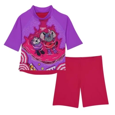 Speedo Girl's Learn to Swim Sun Protection Top & Shorts, Junior Girls, Holiday Wear, UV Protection, Cherry Pink/Sweet Taro, 5YRS5YRS