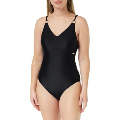 V neck design with twin strap detail. Bust support via seam construction and removable bra pads Adjustable straps enhance the fit Embossed gold branding Premium body shaping fabric- perfect for the beach or pool