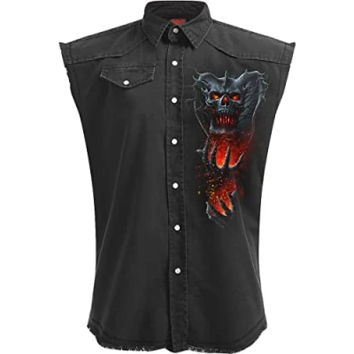 Scattering sparks dance and spit in the malevolent gloom. The clouds turn black as coal and gather overhead, blocking the light from the fearful moon. A demon has been awakened, one of fire and bone…and there is Hell to pay. Sleeveless Stone Washed Worker Black is made of Stone Washed 100% Cotton, Denim using skin friendly, Azo-free, Reactive dyes. Established since 1990, Spiral has been consistently rolling out cool merchandise for the Gothic and Heavy Metal markets. Spiral is not just a brand …it's an ATTITUDE! Where 'Art meets Fashion', Spiral artwork covers a range of themes from tribal, gothic, horror, fantasy and fetish to the more cute and cuddly along with Spiral's own take on various TV and Film characters, all screen printed to last. Just one of the unique from a huge range of Alternative Fashion products from Spiral!