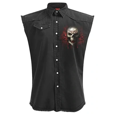 You know it is Game Over if you see this skeleton Reaper with his carved knuckles. Tribal back print with You Lose carved in to the skull s forehead. Sleeveless Stone Washed Worker Black is made of Stone Washed 100% Cotton, Denim using skin friendly, Azo-free, Reactive dyes. Established since 1990, Spiral has been consistently rolling out cool merchandise for the Gothic and Heavy Metal markets. Spiral is not just a brand …it's an ATTITUDE! Where 'Art meets Fashion', Spiral artwork covers a range of themes from tribal, gothic, horror, fantasy and fetish to the more cute and cuddly along with Spiral's own take on various TV and Film characters, all screen printed to last. Just one of the unique 'Workshirts' from a huge range of Alternative Fashion products from Spiral!