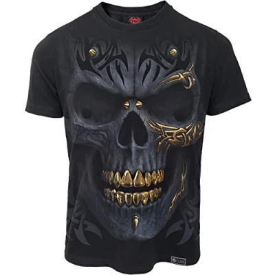 The ink-black pallor of midnight envelopes a skull in the darkness, accentuated with tribal engravings and the shimmer of molten gold. Death finds no solace in the decaying fortunes of the afterlife. Organic T-Shirt is made of 100% Organic Cotton, Jersey using pure organic cotton. Established since 1990, Spiral has been consistently rolling out cool merchandise for the Gothic and Heavy Metal markets. Spiral is not just a brand …it's an ATTITUDE! Where 'Art meets Fashion', Spiral artwork covers a range of themes from tribal, gothic, horror, fantasy and fetish to the more cute and cuddly along with Spiral's own take on various TV and Film characters, all screen printed to last. Just one of the unique from a huge range of Alternative Fashion products from Spiral!