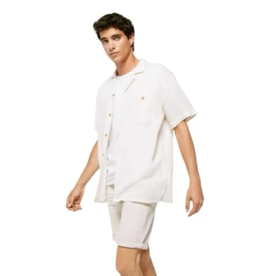 Regular fit 5-pocket Bermuda shorts in ecru stretch denim Design with turn-up hems and microfibre label detail at the coin pocket Soft wash, smart look, with creases on the front ECO-WASH finish produced using sustainable pulverisation, laser and efficient washing technologies. By using these sustainable technologies we're reducing our consumption of water, chemicals and energy. Project RECONSIDER Zip fly