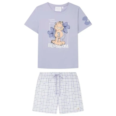 Pyjamas in 100% cotton with shortsleeved top and short bottoms, in lilac with a Garfield print. Printed short bottoms with adjustable elasticated waistband.