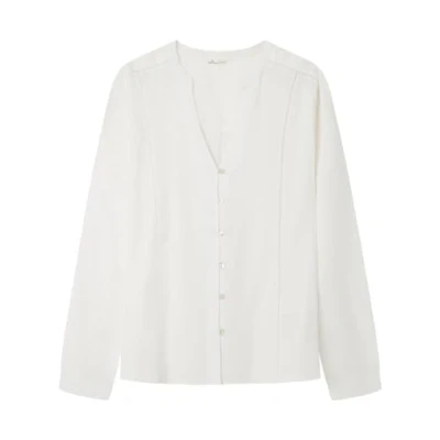 Plain long-sleeved blouse round neck with V-shaped opening with lace insert detail on the sides and buttons on the front and cuffs.
