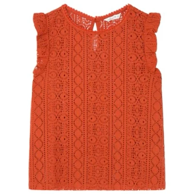Crochet sleeveless round neck T-shirt and ruffles at the armholes with buttoned teardrop opening at the back and lace bobbles at the armhole