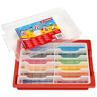 Comes in a Gratnell's tray of 96 pencils with 12 assorted colours, perfect for large classrooms. Take advantage of the triangular design to promote the recommended tripod grip from the early stages. It has a line width of 4.2mm. STABILO Trio thick is available in up to 24 rich colours. Don't forget to post your artwork on social media using #STABILOUK