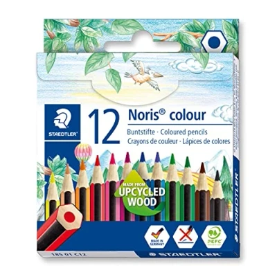 Perfect coloured pencil in hexagonal shape - made from Upcycled Wood Brilliant colours and rich leads for unlimited creativity Soft non-slip surface and high break-resistance for colouring fun without a care Produced using upcycled wood content from sustainably managed, certified forests Pack of 12 half-length (8.5cm) pre-sharpened colouring pencils in assorted colours