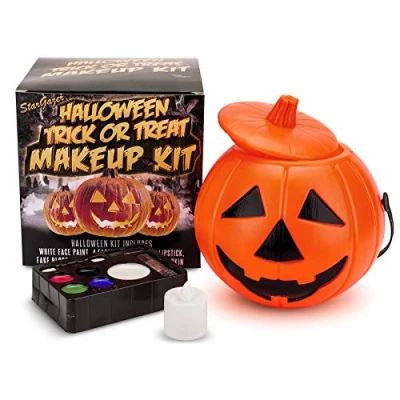 Halloween pumpkin with colour change LED. The trick or treat pumpkin has a handle and lid. The large 17cm Diameter pumpkin is perfect for carrying your treats and sweets. The versatile makeup kit contains fake blood, black lipstick, white face paint, 4 face colour & the applicator. Fantastic gift and kit for a spooky Halloween. great kit for children and adults. Makeup is child-friendly.