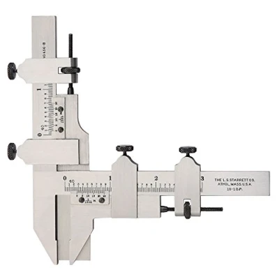 Adjusted independently by screws on the graduated bars Thickness of a tooth at the pitch line is measured by an adjustable jaw after the addendum is set by the adjustable tongue