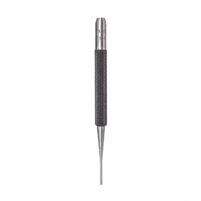 Drive pin punch with 4" overall length, 9/16" pin length, and 1/16" pin diameter pushes pins and rivets into or out of a work piece Hardened and tempered steel provides wear resistance and strength Round shank is knurled for grip Knurled grip for secure holding Made of steel Hardened and tempered Punch diameter clearly marked on the head Measures 1.5 mm diameter by 100 mm length