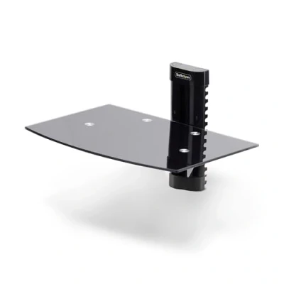 FLOATING WALL MOUNT AV SHELF: 5mm thick black tempered glass shelf (14.2x9.8in / 36x25cm) with an unobstructed surface ideal for organizing AV components (e.g., video conferencing devices or AV receiver) under or above a TV in a boardroom or office HEIGHT ADJUSTABLE: Shelf is height adjustable along the 6.3-inch (161mm) wall mount bracket, allowing the shelf height to be customized to the specific setup and accommodate various AV equipment sizes and configurations DURABLE DESIGN: Supported by a steel bracket, the shelf supports up to 15.4lbs (7kg) while remaining stable and secure; Aluminum wall bracket is sturdy and lightweight for easier installation; Tempered glass is more resisitant to scratches and shattering INSTALLATION: Mount the shelf's bracket to a single wall stud or a concrete wall (wood screws and concrete anchors are included); All hardware for installation and a quick-installation guide are included in the box CABLE MANAGEMENT: Cutouts along each side of the wall mount bracket, allowing for optimal cable positioning; Pre-scored knockouts on the top and bottom caps provide additional cable management options