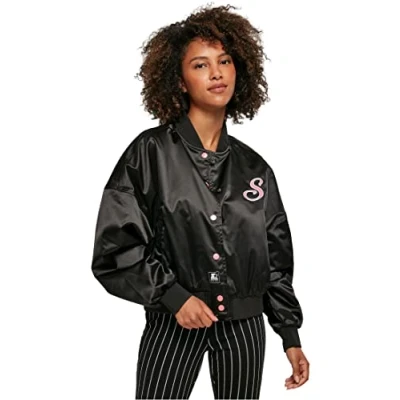 Women's wide college jacket made of shimmering satin Made from satin (polyester and elastane) Oversize fit with wide overcut shoulders Starter application on front and back Side pockets and button placket