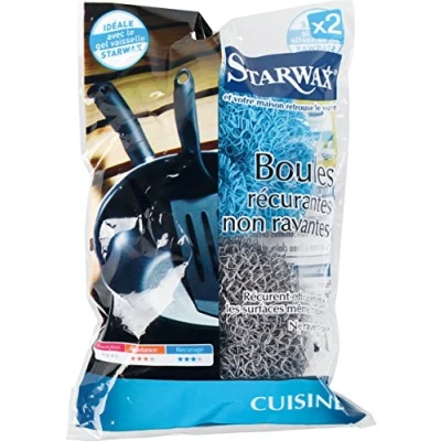 STARWAX Non-scratching Scrubbing Balls is ideal for effectively scrubbing surfaces on a daily basis. Removes cooked dirt and grease and does not scratch Ideal for daily scrubbing of dishes, cutlery, countertop, attached dish, oven rack They remove easily and without scratching dirt and cooked fats from surfaces thanks to the polyester thread wound on itself Non-scratch Scrubbing Balls are perfect for Teflon pans and can be used as a complete solution with Dishwashing Gel without scratching it