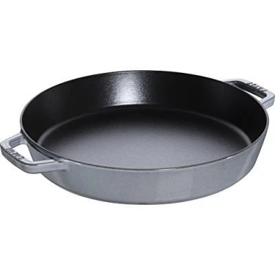 Cast iron pan with short side handles for frying, roasting, baking and serving Cast iron retains heat, keeping dishes hot when served at the table Matte black enamel interior helps to develop great flavour, is scratch resistant and easy to clean Suitable for use in the oven, under the grill and on all hob types including induction Lifetime warranty for domestic use against defects in manufacture and materials; made by STAUB in France