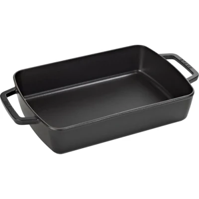 Versatile cast iron rectangular baking dish, ideal for tray baked savoury dishes, cakes, bread and for roasting meat or vegetables Bake or roast in the oven and serve at the table; cast iron retains heat for hot second servings Matte black enamel interior helps to develop great flavour, is scratch resistant and easy to clean Suitable for use in the oven, under the grill and on all hob types including induction Lifetime warranty for domestic use against defects in manufacture and materials; made by STAUB in France
