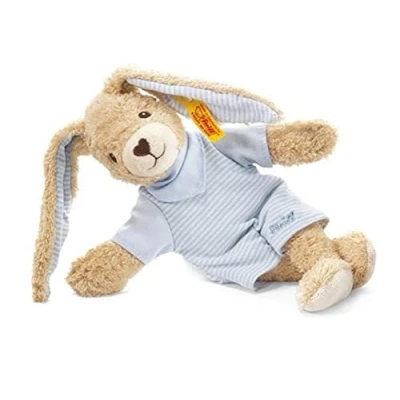Steiff Hoppel Rabbit, dressed in his Blue pyjamas Made of Fluffy, certified organically grown cotton Suitable from birth Suitable for baby soft skin Machine washable @ 30C