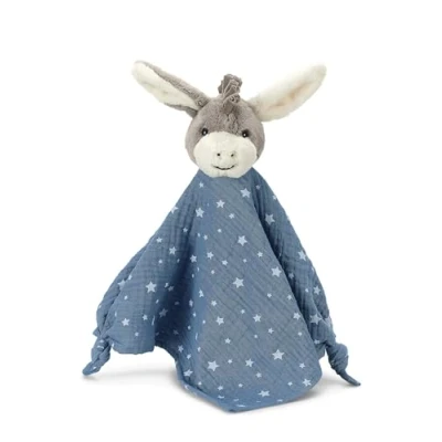 The soft Emmi donkey cuddly blanket made of muslin, fleece and polycotton is the perfect everyday companion for your baby Whether for playing, cuddling, sleeping or telling stories, the cute comforter accompanies you through an unforgettable childhood and gives joy, entertainment and comfort The comfortable fabric is very soft The medium blue cuddly blanket has knot details that are very easy to grip and hold by small hands
