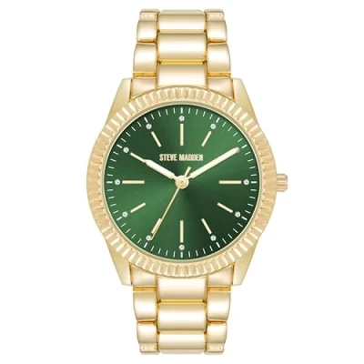 Textured bezel; mineral crystal lens Green sunray dial with white filled gold-tone hands and genuine crystal accented markers; black outer minute track Gold-tone adjustable link bracelet; jewelry clasp and extender Not water resistant