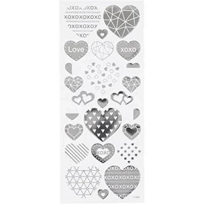 Stickers, sheet 10x24 cm, approx. 25 pc, silver, hearts, 1sheet