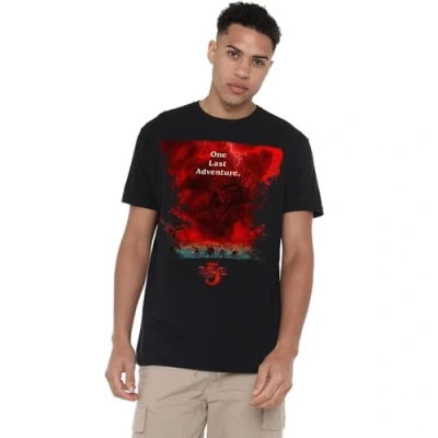 STRANGER THINGS - SEASON FIVE UNISEX T-SHIRT FOR MEN & WOMEN: Crafted from premium ringspun cotton, our T-shirts are the epitome of timeless style. Embrace your individuality with a look as distinct as you are. Created for everyday wear, our tees feature a breathable all-season mid-weight weave, ensuring comfort in a versatile tagless design. Beyond ordinary, our short-sleeve tee is built to last. VERSATILE FIT: Whether you're an icon, influencer, or a myth in the making, discover a facet for every version of yourself. Pre-shrunk for the perfect fit, our tees are meant to be worn daily. With a crew neckline, short sleeves, regular silhouette, and straight hemline, this top is designed for comfort. Casual and classic, it's the ideal choice for any occasion. Only good vibes here. OFFICIALLY LICENSED - Discover exeptional style with our officially licensed pop culture designs! Created by our in-house graphic art team, each piece is a proud representation of craftsmanship, meticulously designed and printed in the UK. Showcase your favorite characters and themes, making every wear a statement of your unique style! EFFORTLESS CARE: From school and work to hanging out with mates, our classic tee is tailored for the real world. No complicated care instructions – simply wear, wash, repeat. Launder cold and tumble or hang dry to maintain the longevity of your new favourite shirt. PERFECT GIFTING OPTION: Ideal for sharing the love, our thoughtfully crafted and vividly rendered T-shirts are perfect for any superfan. Kit your loved ones out for their next birthday, holiday, themed event, Christmas or special occasion.