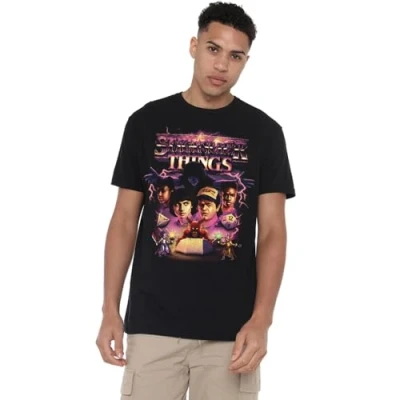 STRANGER THINGS - SEASON FOUR UNISEX T-SHIRT FOR MEN & WOMEN: rafted from premium ringspun cotton, our T-shirts are the epitome of timeless style. Embrace your individuality with a look as distinct as you are. Created for everyday wear, our tees feature a breathable all-season mid-weight weave, ensuring comfort in a versatile tagless design. Beyond ordinary, our short-sleeve tee is built to last. VERSATILE FIT: Whether you're an icon, influencer, or a myth in the making, discover a facet for every version of yourself. Pre-shrunk for the perfect fit, our tees are meant to be worn daily. With a crew neckline, short sleeves, regular silhouette, and straight hemline, this top is designed for comfort. Casual and classic, it's the ideal choice for any occasion. Only good vibes here. OFFICIALLY LICENSED - Discover exeptional style with our officially licensed pop culture designs! Created by our in-house graphic art team, each piece is a proud representation of craftsmanship, meticulously designed and printed in the UK. Showcase your favorite characters and themes, making every wear a statement of your unique style! EFFORTLESS CARE: From school and work to hanging out with mates, our classic tee is tailored for the real world. No complicated care instructions – simply wear, wash, repeat. Launder cold and tumble or hang dry to maintain the longevity of your new favourite shirt. PERFECT GIFTING OPTION: Ideal for sharing the love, our thoughtfully crafted and vividly rendered T-shirts are perfect for any superfan. Kit your loved ones out for their next birthday, holiday, themed event, Christmas or special occasion.