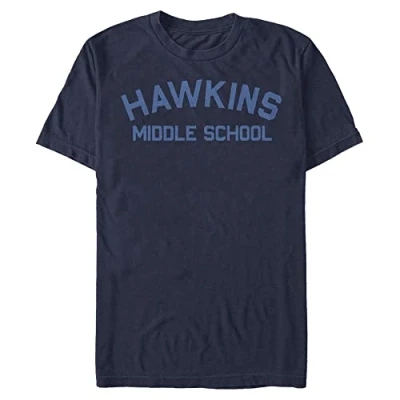 Stranger Things Men's Hawkins Mid School Short Sleeve T Shirt, Navy, L