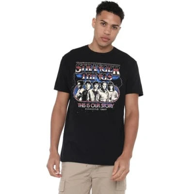 STRANGER THINGS - SEASON FIVE UNISEX T-SHIRT FOR MEN & WOMEN: Crafted from premium ringspun cotton, our T-shirts are the epitome of timeless style. Embrace your individuality with a look as distinct as you are. Created for everyday wear, our tees feature a breathable all-season mid-weight weave, ensuring comfort in a versatile tagless design. Beyond ordinary, our short-sleeve tee is built to last. VERSATILE FIT: Whether you're an icon, influencer, or a myth in the making, discover a facet for every version of yourself. Pre-shrunk for the perfect fit, our tees are meant to be worn daily. With a crew neckline, short sleeves, regular silhouette, and straight hemline, this top is designed for comfort. Casual and classic, it's the ideal choice for any occasion. Only good vibes here. OFFICIALLY LICENSED - Discover exeptional style with our officially licensed pop culture designs! Created by our in-house graphic art team, each piece is a proud representation of craftsmanship, meticulously designed and printed in the UK. Showcase your favorite characters and themes, making every wear a statement of your unique style! EFFORTLESS CARE: From school and work to hanging out with mates, our classic tee is tailored for the real world. No complicated care instructions – simply wear, wash, repeat. Launder cold and tumble or hang dry to maintain the longevity of your new favourite shirt. PERFECT GIFTING OPTION: Ideal for sharing the love, our thoughtfully crafted and vividly rendered T-shirts are perfect for any superfan. Kit your loved ones out for their next birthday, holiday, themed event, Christmas or special occasion.